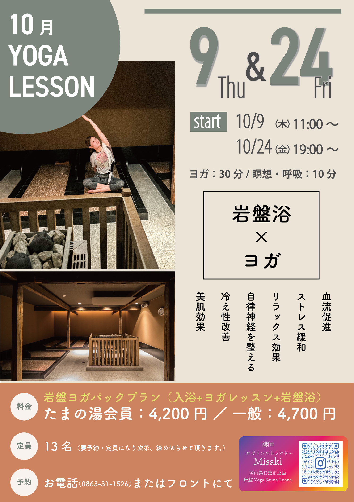 瀬戸内温泉たまの湯では、10/9(木)・24(金)に岩盤ヨガを開催いたします。