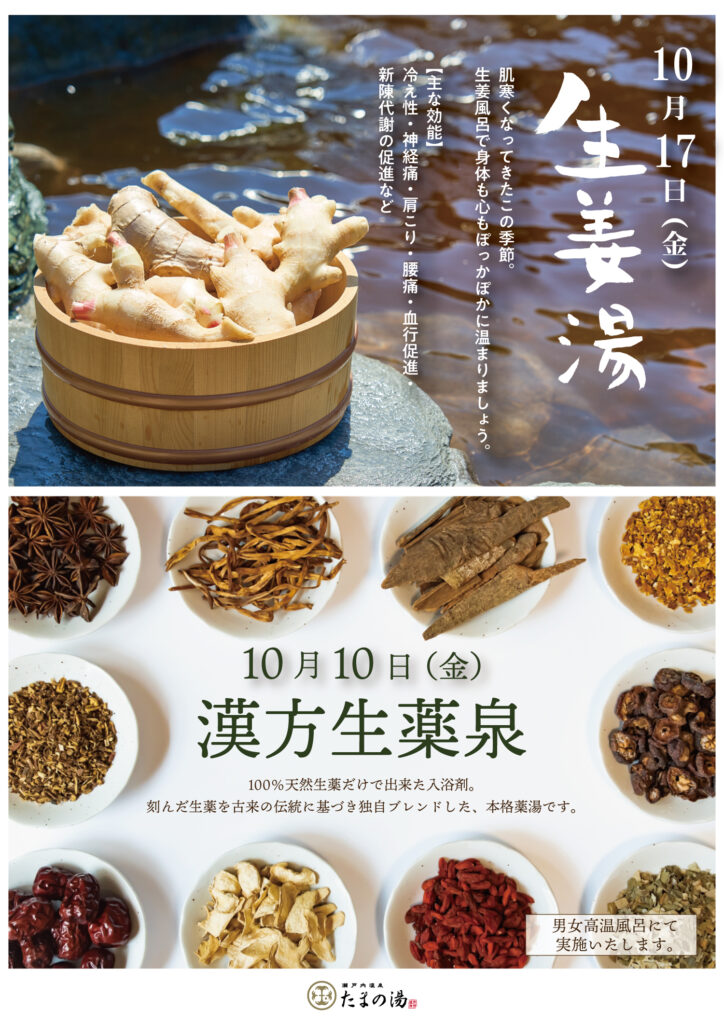 肌寒くなってきたこの季節。生姜風呂で身体も心もぽっかぽかに温まりましょう。