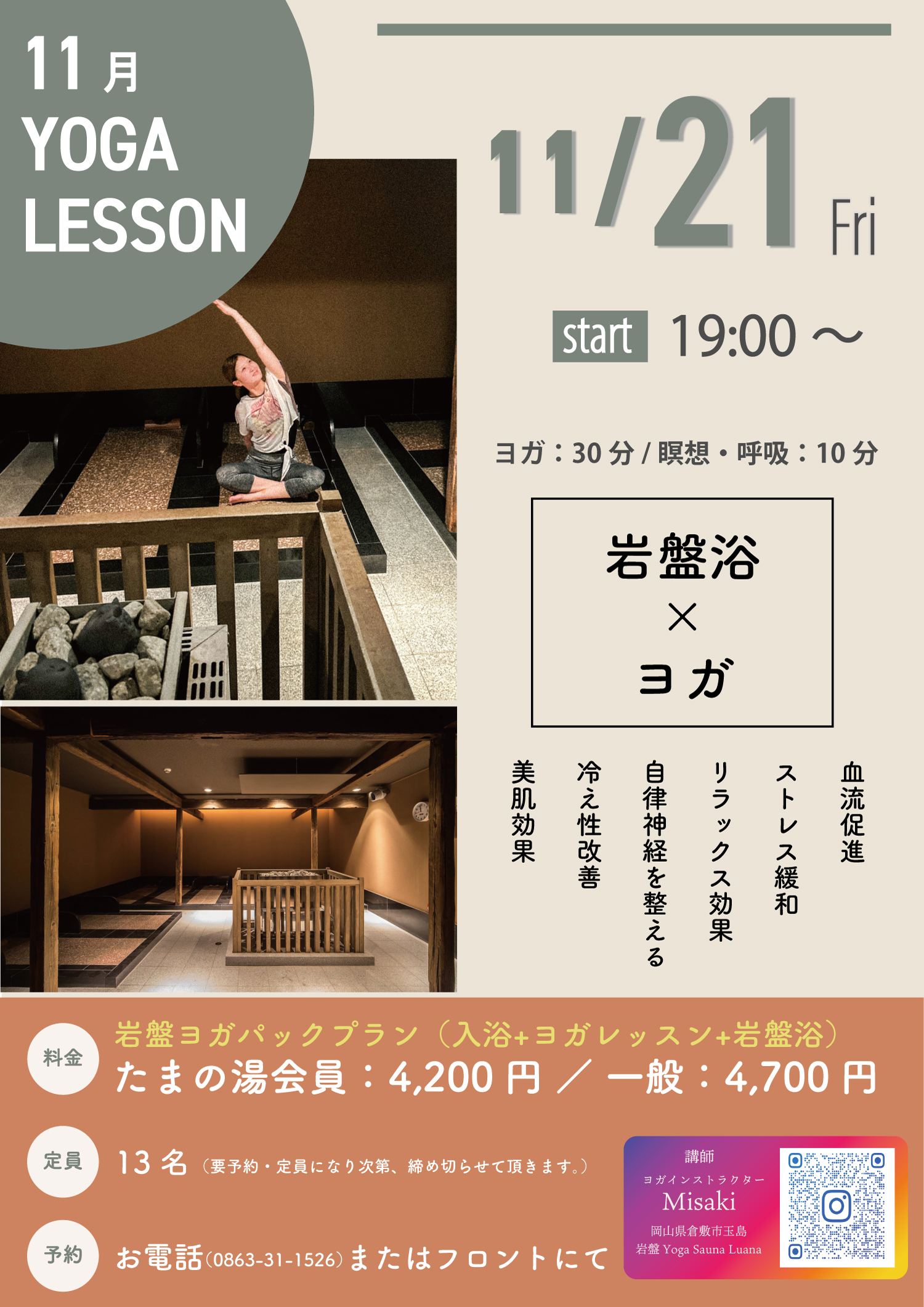 瀬戸内温泉たまの湯では、11/21(金)に岩盤ヨガを開催いたします。