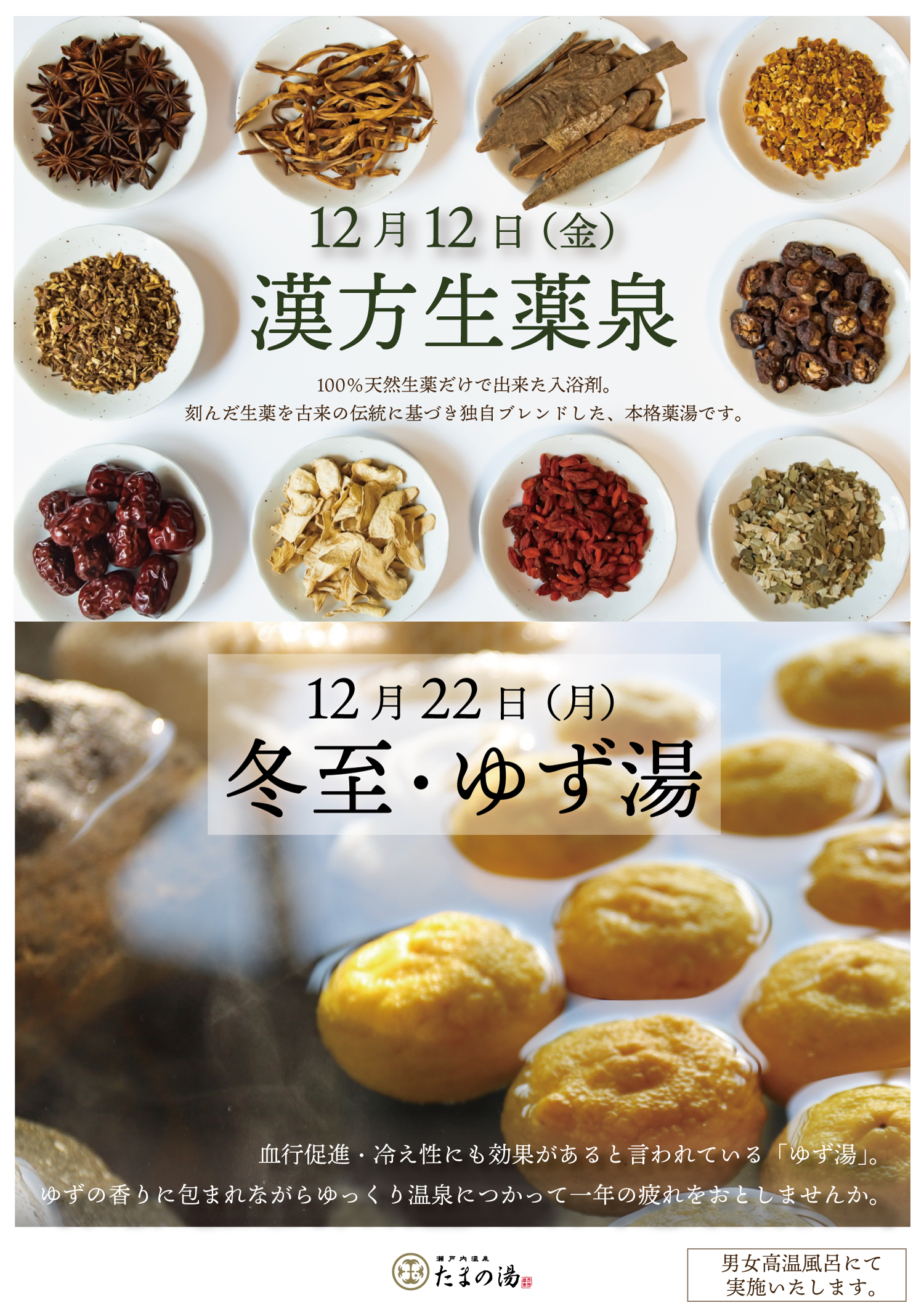 12月22日(月)は、冬至のゆず湯をお楽しみください。