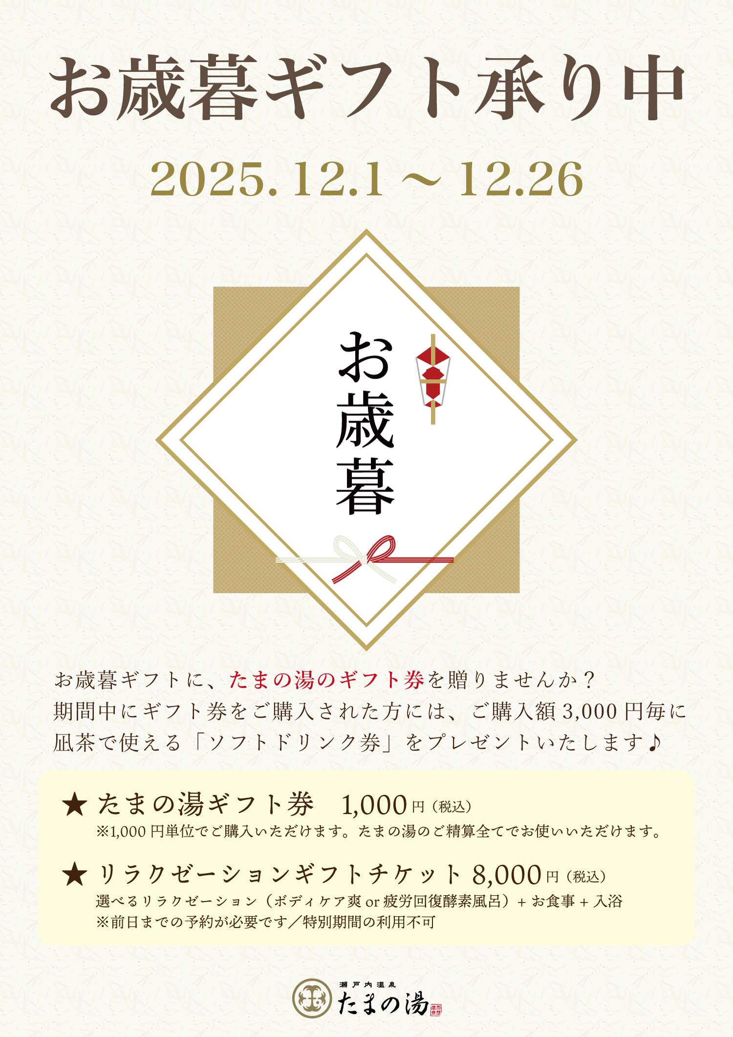 12/1~12/26の期間中に、「たまの湯ギフト券1,000円/枚」または「リラクゼーションギフトチケット8,000円」をご購入された方には、ご購入額3,000円毎に凪茶で使えるソフトドリンク券をプレゼントいたします♪