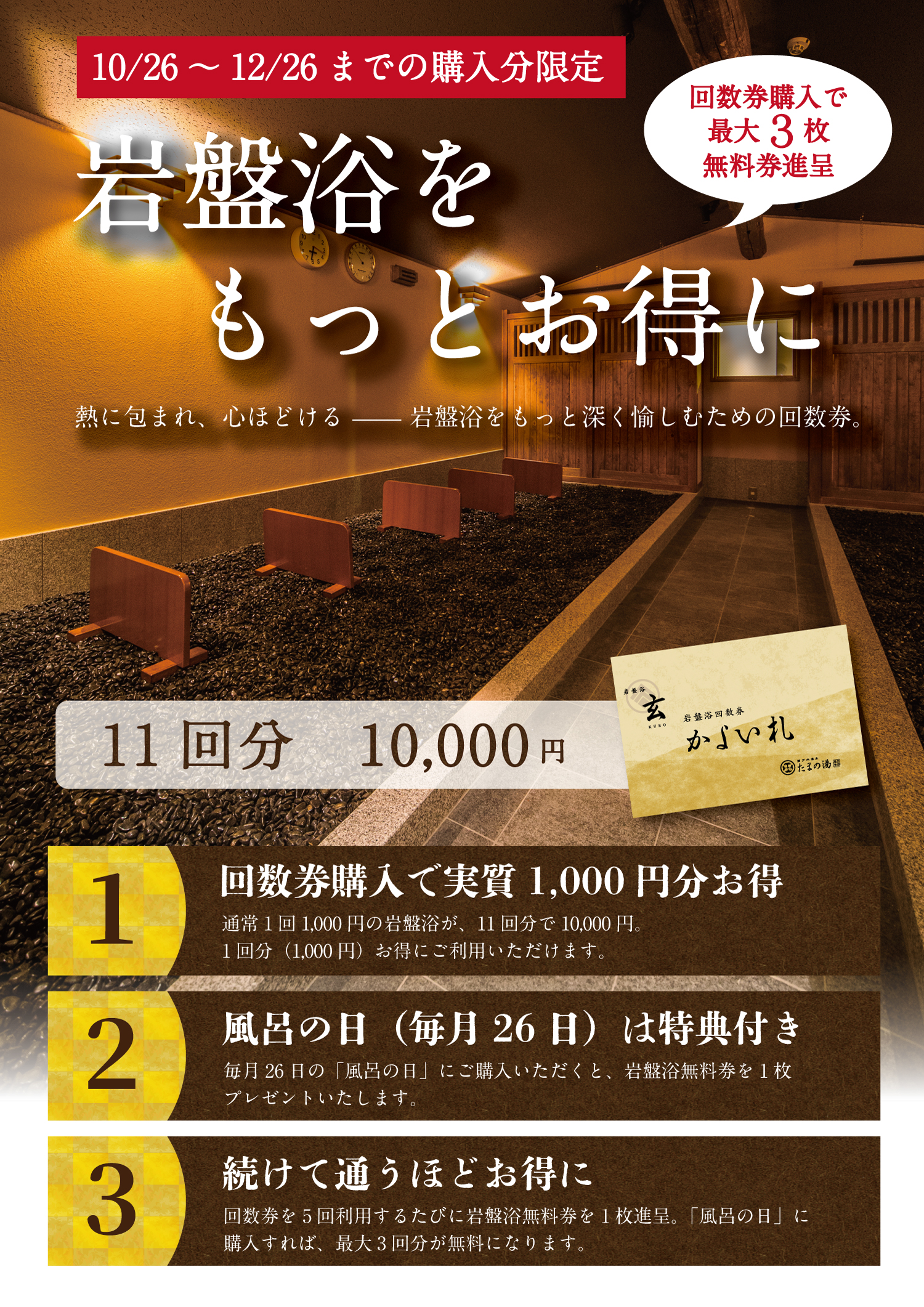 ■キャンペーン期間 2025年10月26日(日)~12月26日(金) ■対象 たまの湯会員 ■キャンペーン内容 期間中に岩盤浴回数券を購入されたお客様に、スタンプ5回ごとに「岩盤浴無料券」1枚をプレゼントいたします。 さらに、風呂の日(毎月26日)にご購入いただくと特典が重なり、最大で3枚の岩盤浴無料券を受け取ることができます。 |